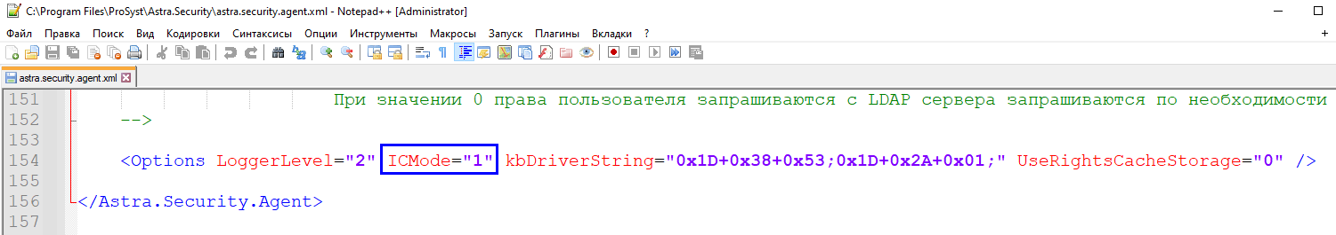 2.В конфигурационном файле astra.security.agent.xml назначьте атрибуту ICMode тега <Options> значение: