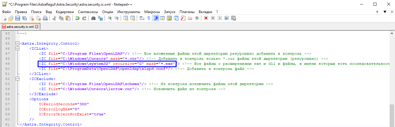 Можно исключить из контроля целостности все папки, вложенные в контролируемую папку, и их содержимое. Чтобы контроль целостности не выполнялся для вложенных папок и их содержимого, укажите значение "0" для атрибута recursive тега <IC file>.