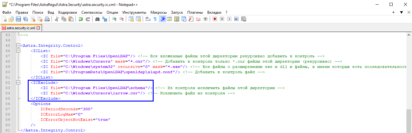 Можно исключить из контроля целостности конкретный файл или папку, вложенную в контролируемую папку, и ее содержимое. Для этого укажите полный путь к исключаемым файлам и папкам здесь же в качестве значения атрибута IC file тега <ICExclude>.