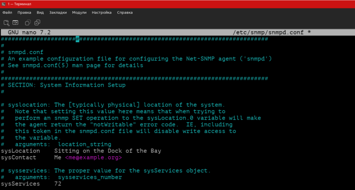 7. Откройте файл конфигурации "snmpd.conf", выполнив команду: