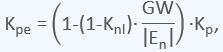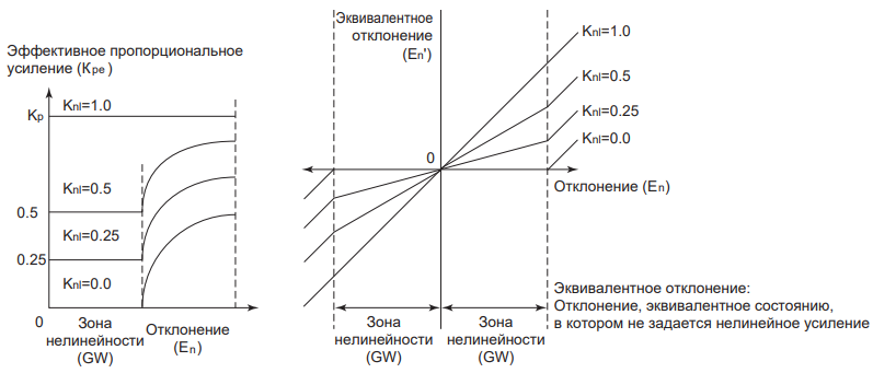 Если задан коэффициент нелинейного усиления Knl, для расчета эффективного пропорционального усиления Kpe, когда отклонение находится в зоне GW, используется выражение: