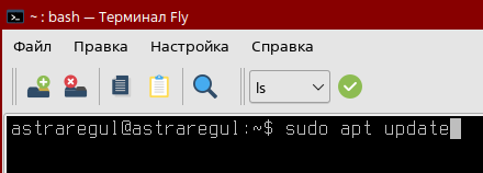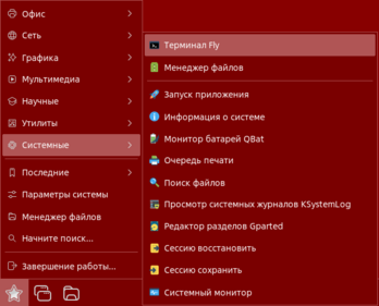 1. Откройте терминал Fly. Для этого зайдите в меню "Пуск" (расположено в левом нижнем углу) → "Системные" → Терминал Fly. Либо нажмите комбинацию клавиш "Alt+T".