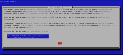 10. Выберите диск, на который необходимо установить GRUB с помощью клавиши "Space" и нажмите кнопку "Ok":