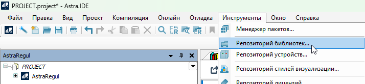 2. Раскройте проект Astra.IDE и перейдите во вкладку Инструменты -> Репозиторий библиотек.