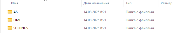 12. В случае успешной операции экспорта в папке с проектом сформируется 3 новых папки AS, HMI, SETTINGS.