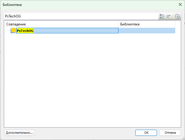 8. В открывшемся окне в строке поиска введите название библиотеки PsTechOG и нажмите кнопку "ОК".