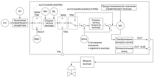 В блоке регуляторного управления результат вычислений управляющего воздействия сначала подвергается процедуре обработки выхода и затем генерируется как значение переменной управляющего выхода MV, как это проиллюстрировано на расположенном ниже рисунке.