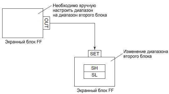 Выходной диапазон блока Fieldbus не может быть определен автоматически. При соединении двух экранных блоков FF инжиниринг осуществляется таким образом, чтобы значения верхнего предела и нижнего предела шкалы обоих блоков совпадали. В каскадном контуре, в котором соединяются выход функционального блока РСУ (например M_PID) с клеммой SET экранного блока FF, для того, чтобы вышестоящий функциональный блок РСУ рассчитывал свое управляющее воздействие (MV) в диапазоне уставки (SV) нижестоящего экранного блока FF необходимо к входам MSH и MSL вышестоящего функционального блока РСУ присвоить значения входов SH и SL нижестоящего экранного блока FF соответственно.