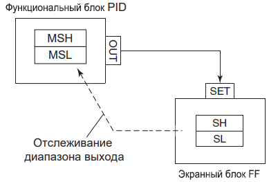 На следующем рисунке представлен пример каскадного соединения функционального блока РСУ (например M_PID) и экранного блока FF, в котором происходит отслеживание диапазона выхода.