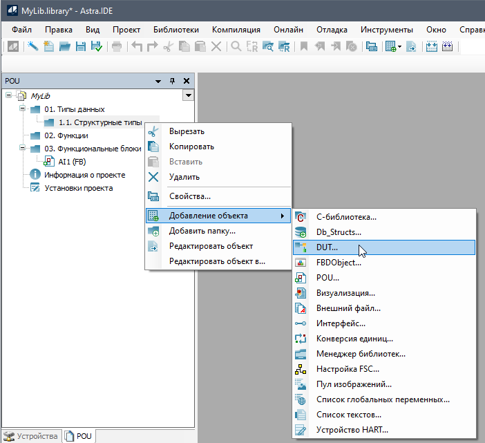 2. Выделите папку "1.1. Структурные типы" и в контекстном меню выберите команду "Добавление объекта" -> "DUT...".