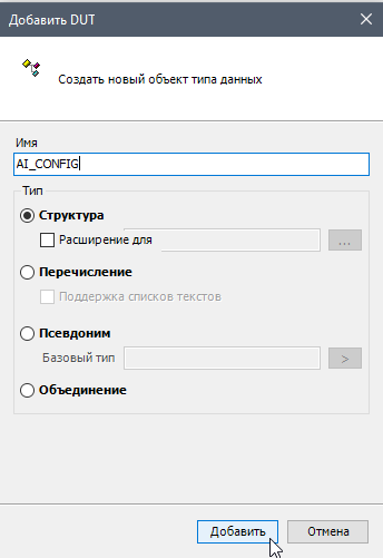 3. Укажите название структуры "AI_CONFIG" и нажмите кнопку "Добавить".