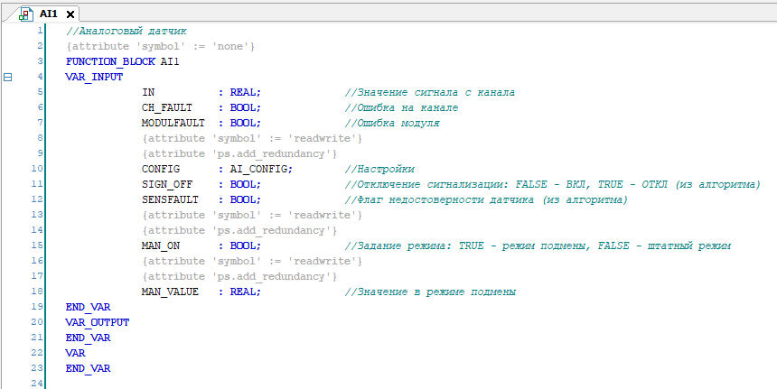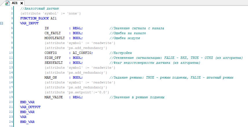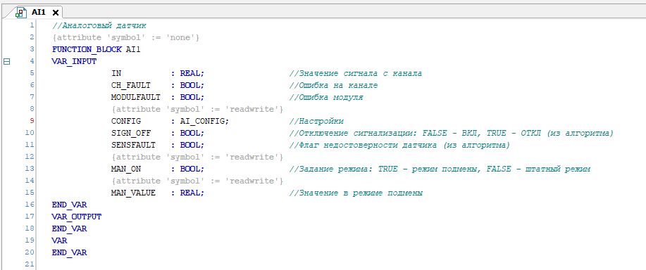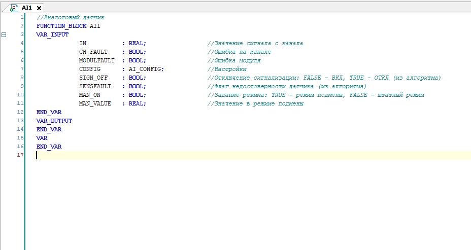 В области "VAR_INPUT" необходимо объявить входные переменные функционального блока (команды, уставки, сигналы с модулей ввода/вывода и т.д.).