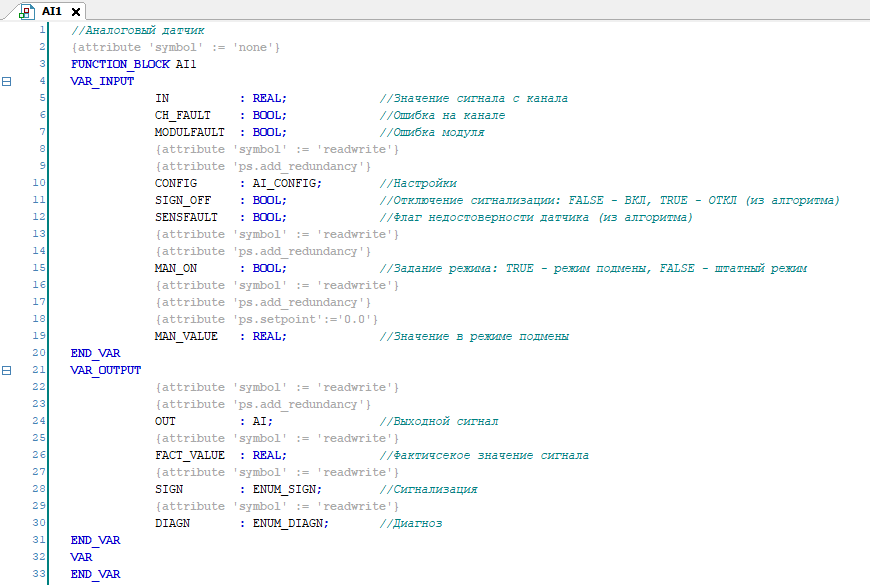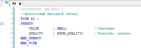 Выходная переменная "OUT" будет представлена в виде переменной структурного типа "AI", который будет включать в себя значение (VALUE) и качество (QUALITY) аналогового сигнала.