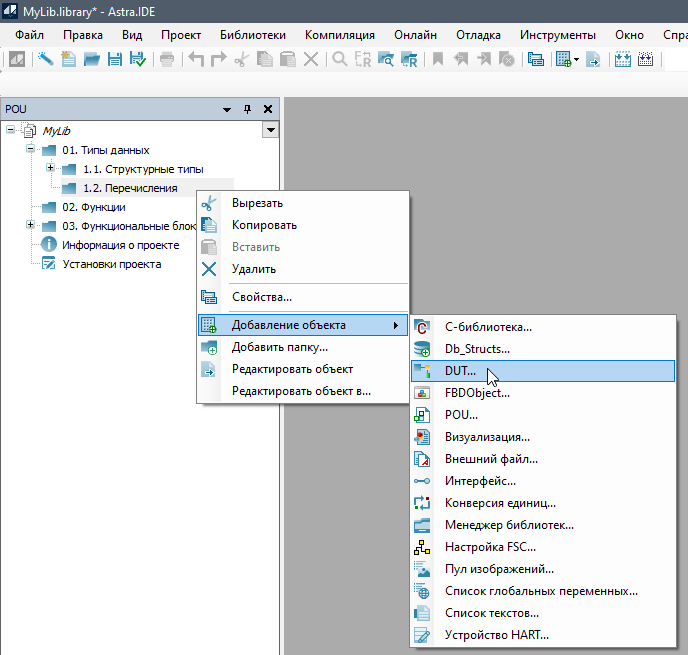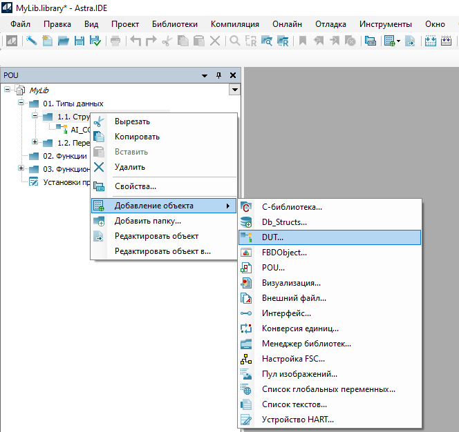 8. Выделите папку "1.1. Структурные типы" и в контекстном меню выберите команду "Добавление объекта" -> "DUT...".