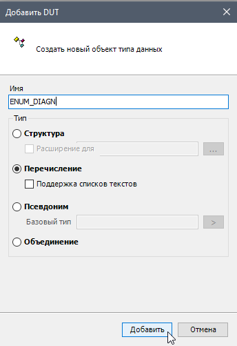 3. Выберите тип "Перечисление", укажите название "ENUM_DIAGN" и нажмите кнопку "Добавить".