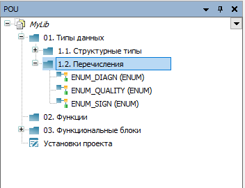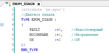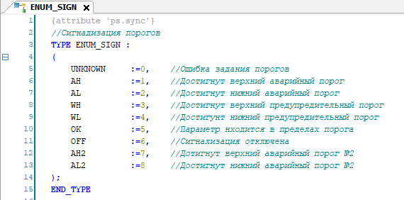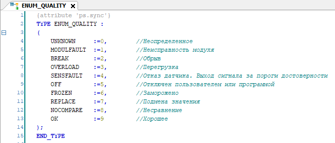 Чтобы инженеру АСУ ТП было удобнее производить отладку алгоритмов, создадим переменные для сигнализации (SIGN), диагностики (DIAGN) и качества аналогового сигнала (QUALITY) в виде перечислений.