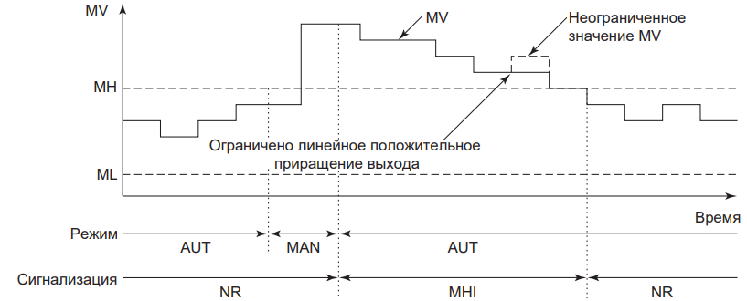 Если значение управляющего выхода MV, установленное при ручном управлении, выпадает из диапазона между заданиями верхнего и нижнего пределов управляющего выхода и если управление переходит в автоматический режим (CAS, AUT, RCAS), ограничитель выхода вынуждает управляющий выход MV принять значение задания верхнего MH или нижнего ML предела так, что управляющий выход MV претерпевает резкое изменение.