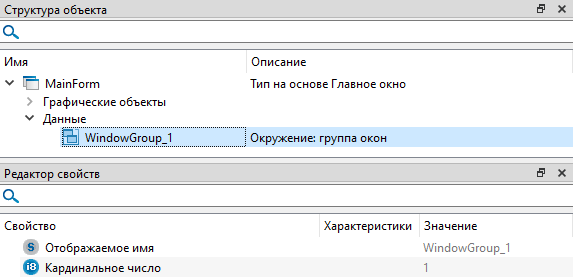 Чтобы взаимодействовать с окнами в группе, добавьте на экранную форму компонент Окружение: группа окон. Компонент невизуальный и виден только в области Структура объекта.