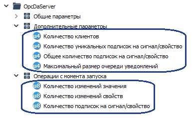 Операции с момента запуска показывают количество операций с сигналами, выполненных OPC DA клиентами с момента запуска модуля.