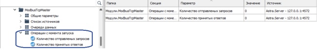 Для просмотра параметров статистики модуля подключитесь к Astra.Server приложением статистики и выберите в дереве модуль Modbus TCP Master.