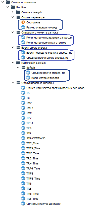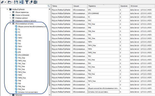 Статистическая информация модуля о количестве обслуживаемых сигналов представлена в группе Обслуживаемые сигналы: