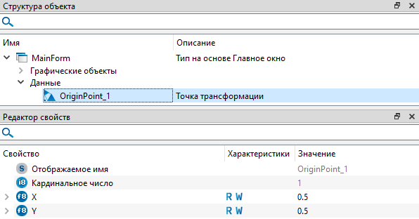 Компонент представляет из себя точку, которая размещается на графическом объекте (родительский объект) формы. Масштабирование и вращение родительского объекта будет происходить относительно координат данной точки. Координаты точки вычисляются относительно того объекта, внутри которого точка находится. Значение точки может варьироваться от 0 до 1. Координата точки 0;0 обозначает верхний левый угол объекта.