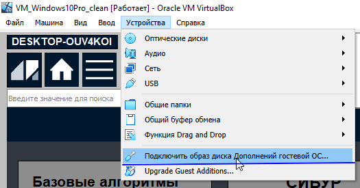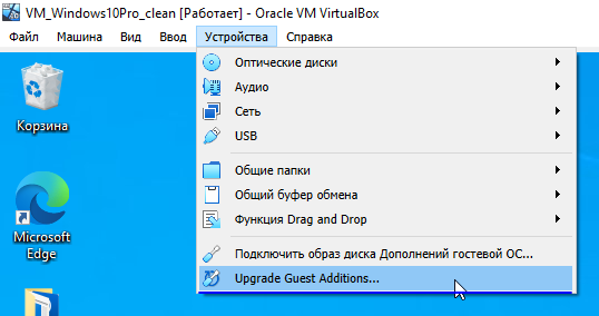 4. Запустите виртуальную машину. Во вкладке "Устройства" выберите пункт "Upgrade Guest Additions". Дождитесь окончания обновления.