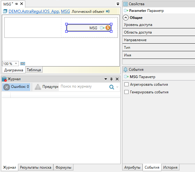 1. В Astra.AStudio добавьте в приложение для сервера ввода/вывода (IOS_App) логический объект и задайте ему имя "MSG".