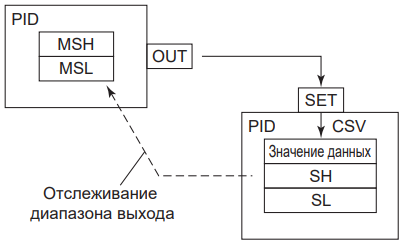 Отслеживание диапазона выхода представляет собой функцию, обеспечивающую соответствие верхнего/нижнего пределов шкалы управляющего выхода (MV) соответствующим значениям адресата выхода, а величины элементов данных, имеющих отношение к управляющему выходу (MV), пересчитываются при изменении верхнего/нижнего пределов шкалы.