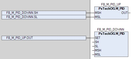 В блоке регуляторного управления обрабатываются данные в физических единицах измерения. По этой причине, когда значение управляющего выхода (MV) вышестоящего функционального блока используется как задание (SV) нижестоящего функционального блока при его каскадном подсоединении, верхние и нижние пределы шкалы обоих блоков должны быть идентичны. Функция отслеживания диапазона выхода обеспечивает соответствие верхнего/нижнего пределов шкалы управляющего выхода (MV) аналогичным пределам шкалы адресата выхода и пересчитает значения элементов данных, связанных с управляющим выходом (MV) при изменении пределов верхнего/нижнего пределов шкалы. Для того, чтобы вышестоящий регулятор рассчитывал свое управляющее воздействие (MV) в диапазоне уставки (SV) нижестоящего регулятора необходимо к входам MSH и MSL вышестоящего регулятора присвоить значения входов SH и SL нижестоящего регулятора соответственно.