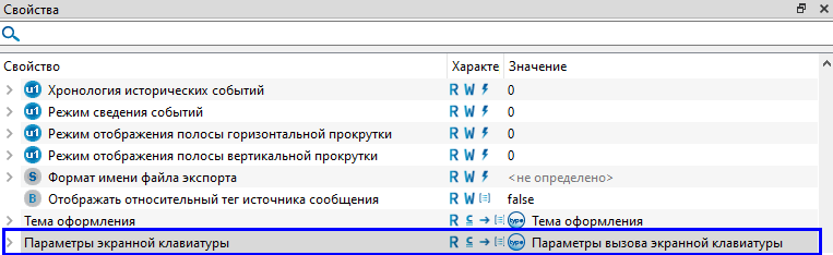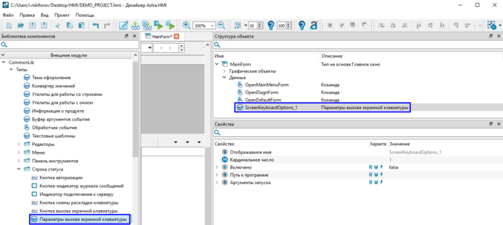 Чтобы добавить экземпляр типа Параметры вызова экранной клавиатуры в проект, перетяните тип на рабочую область. Компонент невизуальный и отображается в области Структура объекта.
