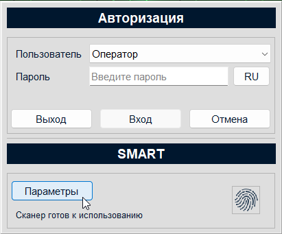 Для открытия окна параметров необходимо нажать на кнопку "Параметры" в окне авторизации. Кнопка доступна только пользователям с правом "sSMARTChangeSettingsEn" из приложения PsBase.