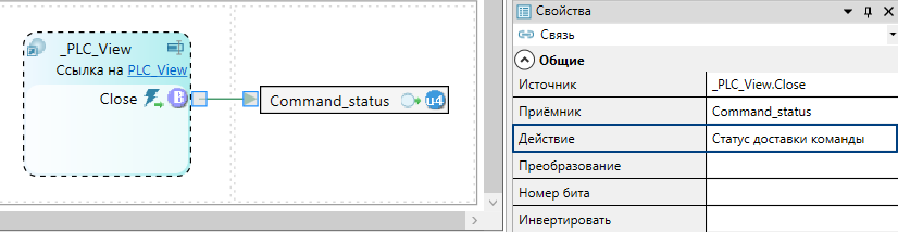 2. Протяните связь от сигнала, в который передаётся команда, к добавленному сигналу и в свойстве Действие выберите «Статус доставки команды».