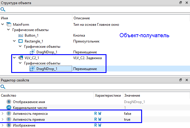 Чтобы создать иллюзию перетаскивания данных, используйте обработчики событий MousePress объекта-отправителя и OnDrop элемента Перемещение на стороне объекта-получателя. Укажите передаваемые данные в обработчике события MousePress и настройте обработку принимаемых данных в обработчике события OnDrop. Для перетаскивания щелкните на объекте-отправителе и не отпуская клавишу мыши, перетащите данные на объект-получатель.