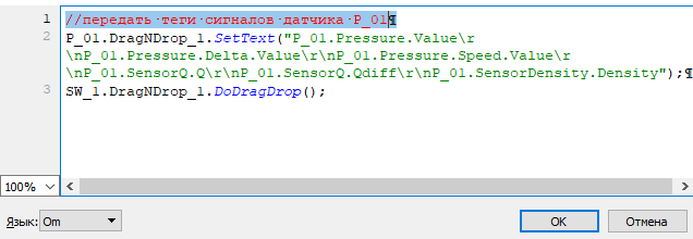 2. В обработчике события MousePress объекта-отправителя укажите размер и имя массива с помощью функции SetDataSize. Укажите передаваемые данные с помощью функции SetDataAt элемента Перемещение. Для каждого элемента массива используйте свою функцию SetDataAt.