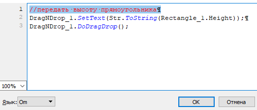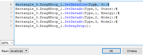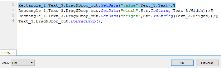 3. Для запуска перемещения данных используйте функцию DoDragDrop элемента Перемещение. Вызывайте функцию сразу же после вызова функции SetText (SetHtml) (см. рисунок выше).