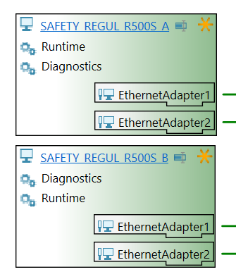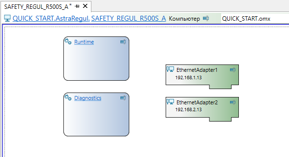 ПЛК SAFETY REGUL R500S вместе с адаптерами Ethernet и исполняющими компонентами (Runtime и Diagnostics) добавляются в топологию проекта автоматически при выполнении экспорта проекта в Astra.IDE.