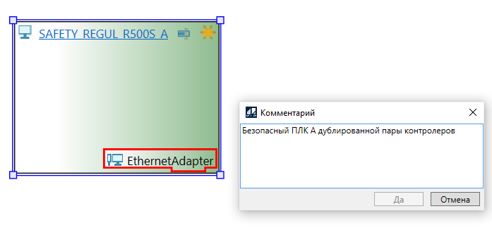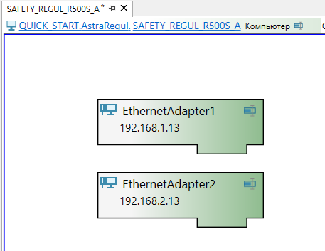 Перейдите в компонент "Компьютер" и перетащите в рабочую область из "Панели элементов" необходимое количество адаптеров "Ethernet".Рекомендуется использовать резервируемую линию связи (два адаптера Ethernet).У каждого адаптера необходимо настроить свойства "Имя", "Адрес" и "Сеть". В свойстве "Адрес" укажите IP-адрес порта ПЛК. Сеть выбирается из выпадающего списка: для каждого адаптера - своя сеть.