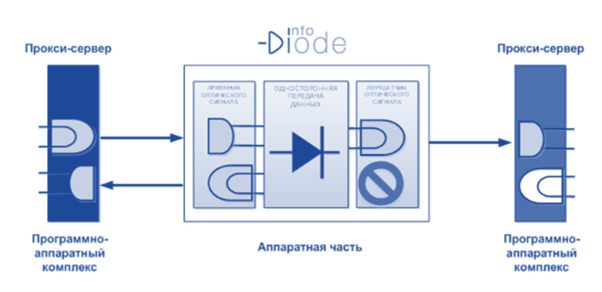 Физическое разделение сегментов сети базируется на принципе «гальванической развязки», что полностью исключает возможность послать через «диод» какой-либо сигнал внутрь защищаемого или изолируемого сегмента. В случае установки «диода» сохраняется возможность передачи сигналов и данных только в одном направлении. Это позволяет защищаемому сегменту эффективно и оперативно «делиться» данными с внешними потребителями без угрозы со стороны недоверенных сетей.