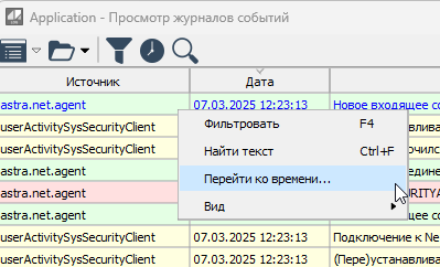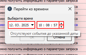Если в журнале событий нет событий, соответствующих запросу времени, то произойдет переход к событию, ближайшему по времени. Это событие будет подсвечено синим цветом.