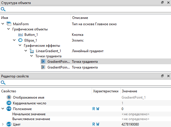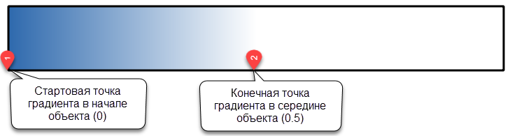 Свойства точек градиента – положение точек начала или конца цветового перехода. Измеряется от 0 до 1, где 0 - начало объекта, 1 - конец объекта. На картинке и в примере ниже показано, что старт линейного градиента находится в самом начале объекта (значение 0), а конец градиента наступает уже к середине объекта (значение 0.5).