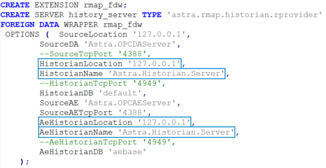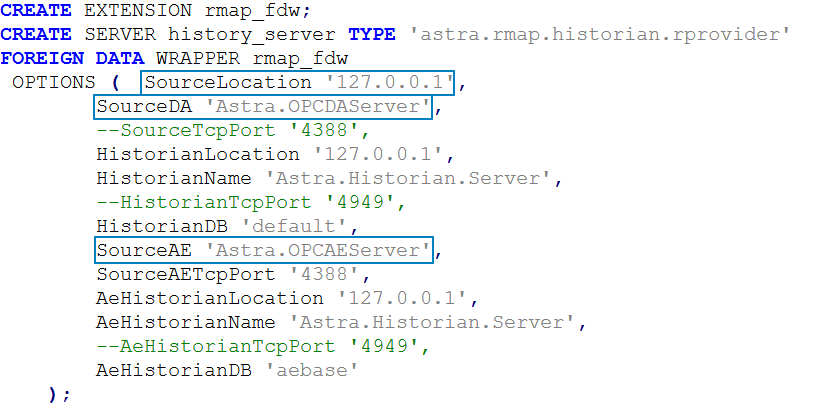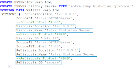 Чтобы получать данные Astra.Server и Astra.Historian по OPC, укажите значения соответствующих атрибутов параметра OPTIONS команды SQL CREATE SERVER.