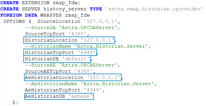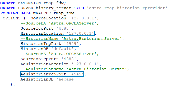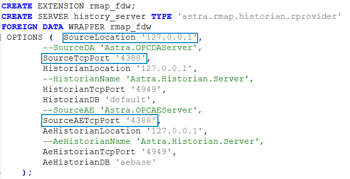 Чтобы получать данные Astra.Server и Astra.Historian по TCP, укажите значения соответствующих атрибутов параметра OPTIONS команды SQL CREATE SERVER.