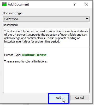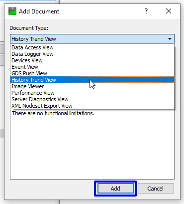 2. В открывшемся окне выберите тип документа "History Trend View" и нажмите кнопку "Add".
