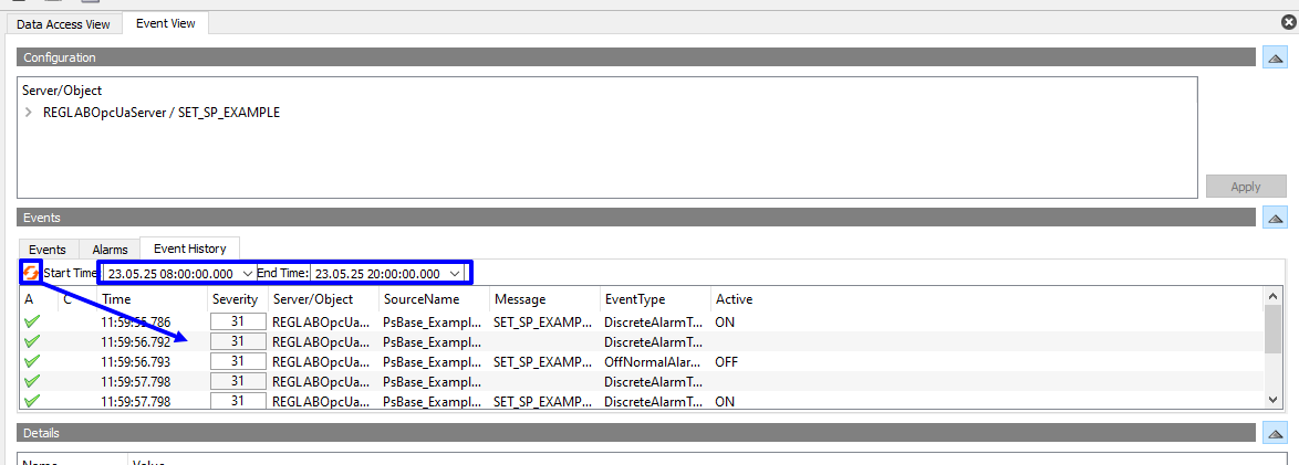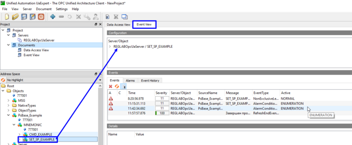 2. Сигналы, для которых требуется получить историю связанных с ними событий, переместите из адресного пространства сервера на вкладку Event View.