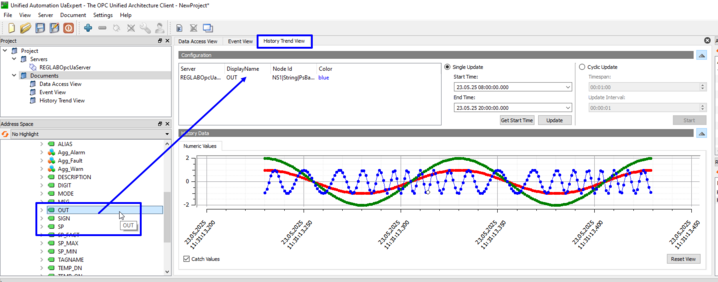 3. Сигналы, для которых требуется получить историю значений, переместите из адресного пространства сервера на вкладку "History Trend View".