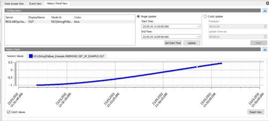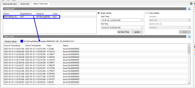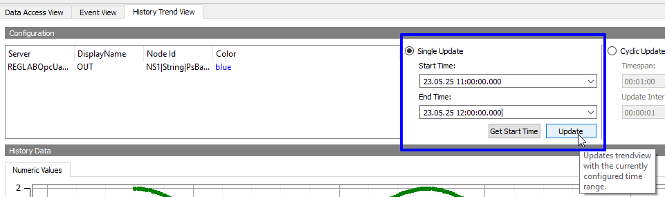 4. В области "Single Update" укажите период времени, за который требуется получить историю значений, и нажмите кнопку "Update"