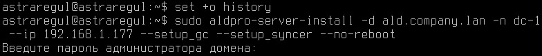 Выполним повышение роли сервера до контроллера домена:set +o historysudo aldpro-server-install -d ald.company.lan -n dc-1 --ip 192.168.1.177 --setup_gc --setup_syncer --no-rebootset -o historyПосле ввода команды система запросит пароль администратора домена, который будет установлен для доменного пользователя admin и суперпользователя LDAP-каталога cn=Directory Manager. Пароль должен быть не менее 8 символов.