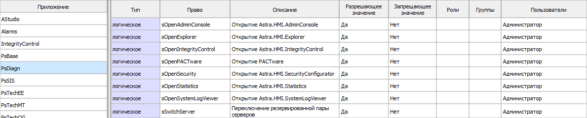 Права доступа для библиотеки представлены в файле PsDiagn.json. Данный файл расположен в папке HMI\resources\PsDiagn\SECURITY.