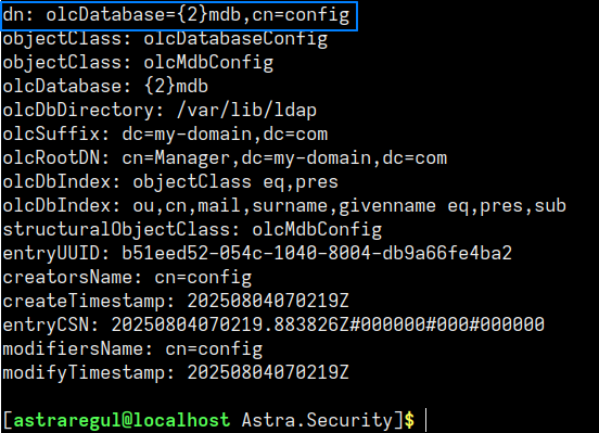 Проверьте имя и тип базы данных (hdb, mdb, и т.п.) с помощью команды:sudo slapcat -n0